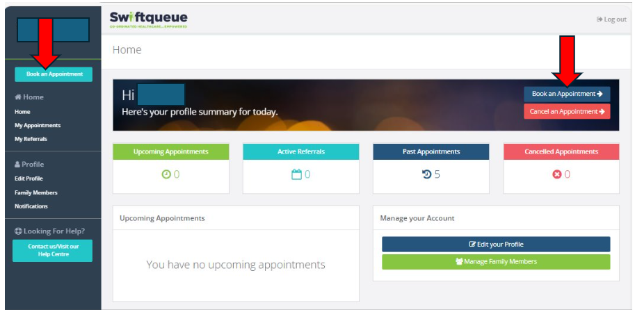 - Once you click I agree, you will automatically be redirected to the Swiftqueue patient portal where you can now book your appointment.