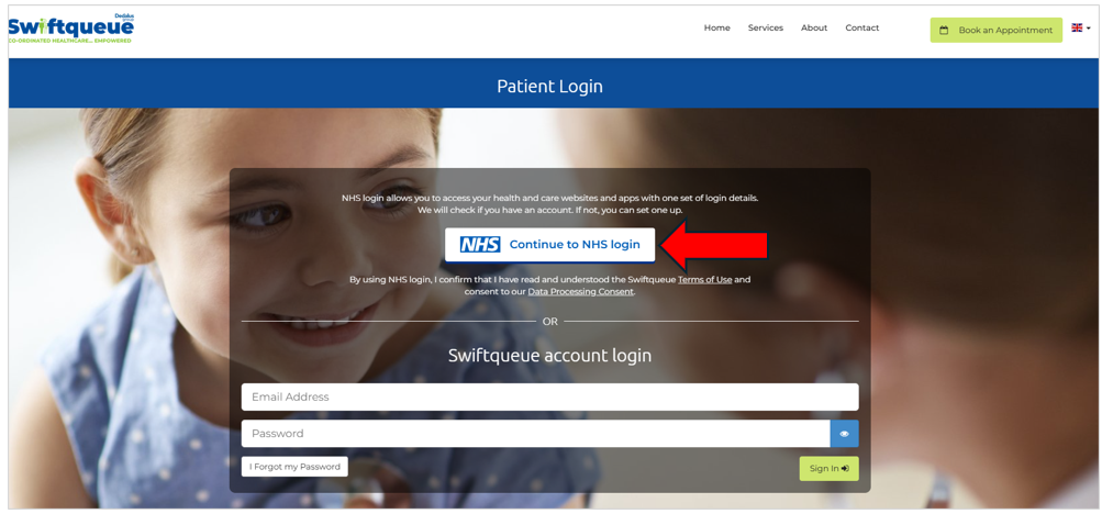 - Instead you will be prompted to create an NHS login via the 'Continue to NHS login button' which will then enable you to book your healthcare appointment on Swiftqueue.