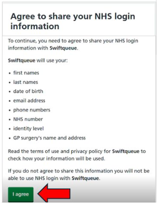 - Agree to share your NHS login information with Swiftqueue by clicking the I agree button.