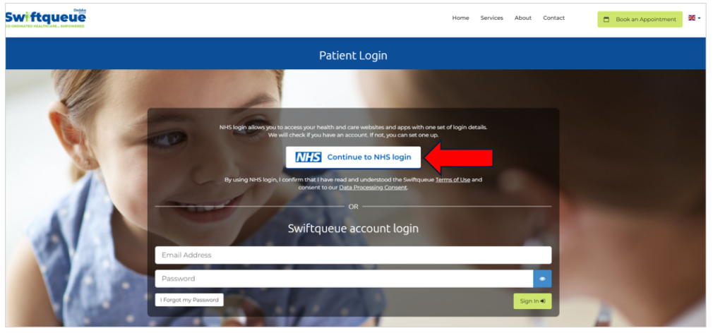 - Login to your Swiftqueue patient portal by clicking on the Continue to NHS login button, click on upcoming appointments.