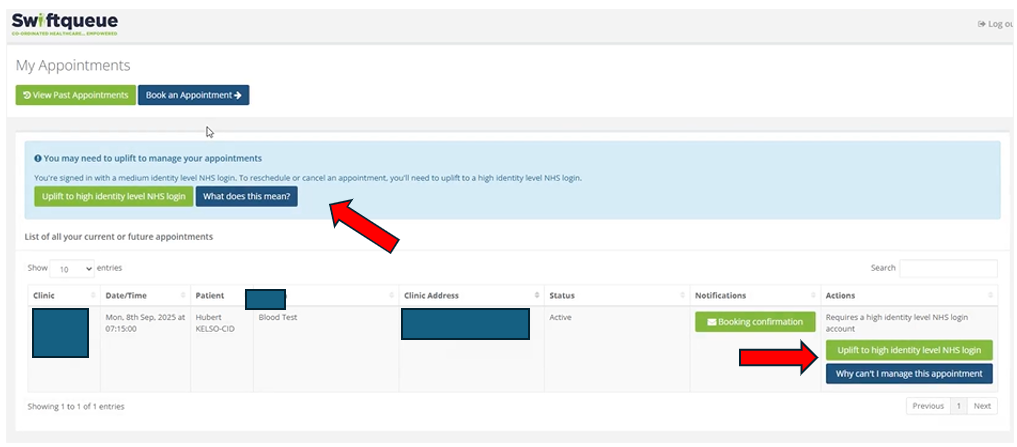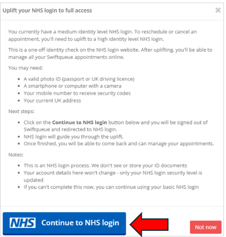 - If your NHS login is not set to high identity level, you may be asked to uplift your account in order to manage your appointments.